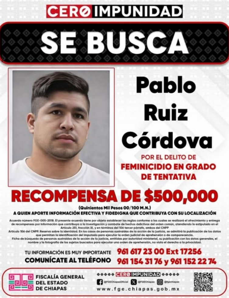 La Fiscalía General del Estado (FGE) de Chiapas no ha escatimado recursos para dar con el paradero del prófugo. Actualmente, se ofrece una recompensa de 500,000 pesos a quien brinde datos fidedignos para su captura.