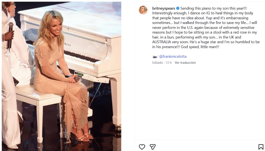 La cantante compartió una fotografía de sus años dorados, cuando dominaba los escenarios a principios de los 2000, y aprovechó el recuerdo para revelar que planea retomar presentaciones fuera de Estados Unidos, país donde, según sus propias palabras, no volverá a cantar por motivos profundamente personales. En contraste, adelantó que Reino Unido y Australia podrían ser los primeros destinos donde la Princesa del Pop reaparezca, esta vez en un formato más íntimo y especial.