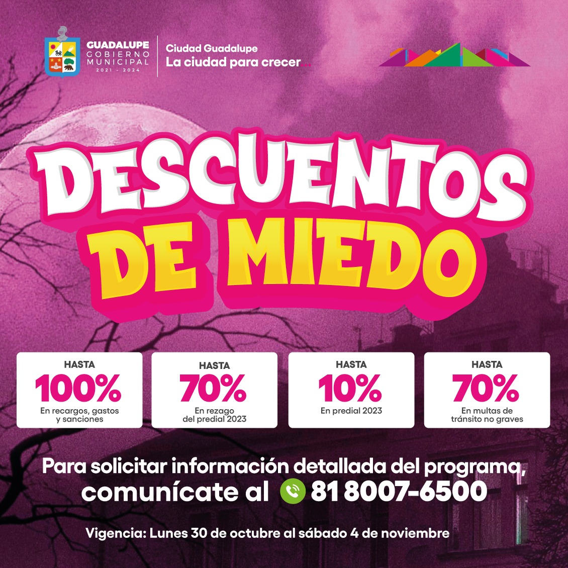 Guadalupe, 26 de octubre de 2023 – Con el objetivo de brindar apoyo a la economía familiar y alentar a más contribuyentes a ponerse al corriente, el Gobierno de Guadalupe anuncia el inicio del Programa «Descuentos de Miedo» a partir del próximo lunes 30 de octubre hasta el 5 de noviembre. Este programa abarca descuentos en el pago del predial, modernización catastral y multas de tránsito, según lo informado por la Alcaldesa Cristina Díaz.
