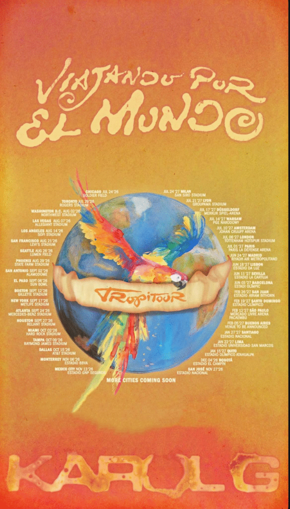 La artista Karol G anunció su nueva gira mundial Tropitour 2026, un proyecto que apuesta por una estética caribeña y una mezcla de ritmos como reggaetón, bachata y merengue. La propuesta busca marcar una etapa distinta en su carrera, con un espectáculo más visual, colorido y centrado en sonidos tropicales.