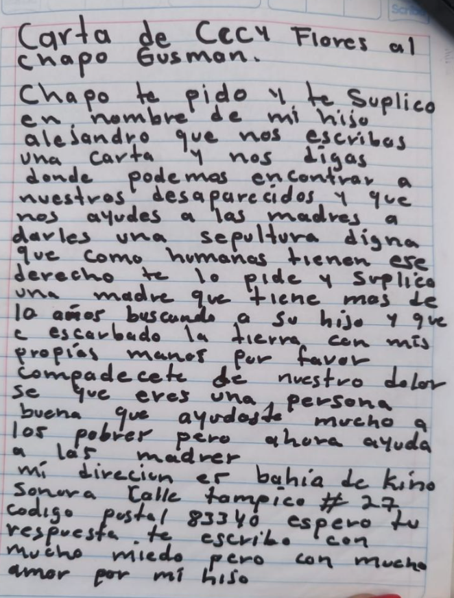 “Vi su carta y pensé que si él busca justicia para sí mismo, quizá pueda comprender nuestro dolor y ayudarnos”, dijo Flores. En su misiva, solicita información para localizar a los desaparecidos y pide, con un tono suplicante, que compadezca a las madres que llevan años buscando sin descanso.