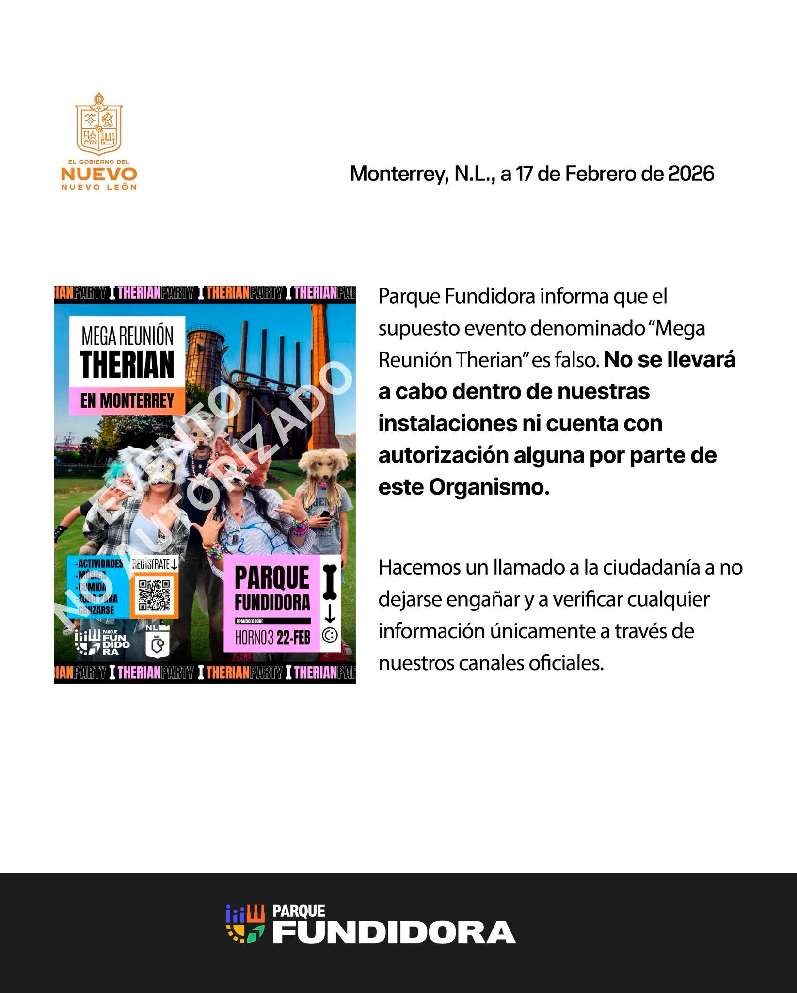 Luego de que en redes sociales comenzara a difundirse una imagen que anunciaba una presunta “Mega Reunión Therian” en Monterrey, el Parque Fundidora aclaró que dicho evento no está contemplado en su agenda ni cuenta con permiso para realizarse en el recinto.